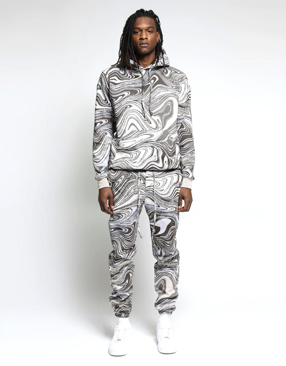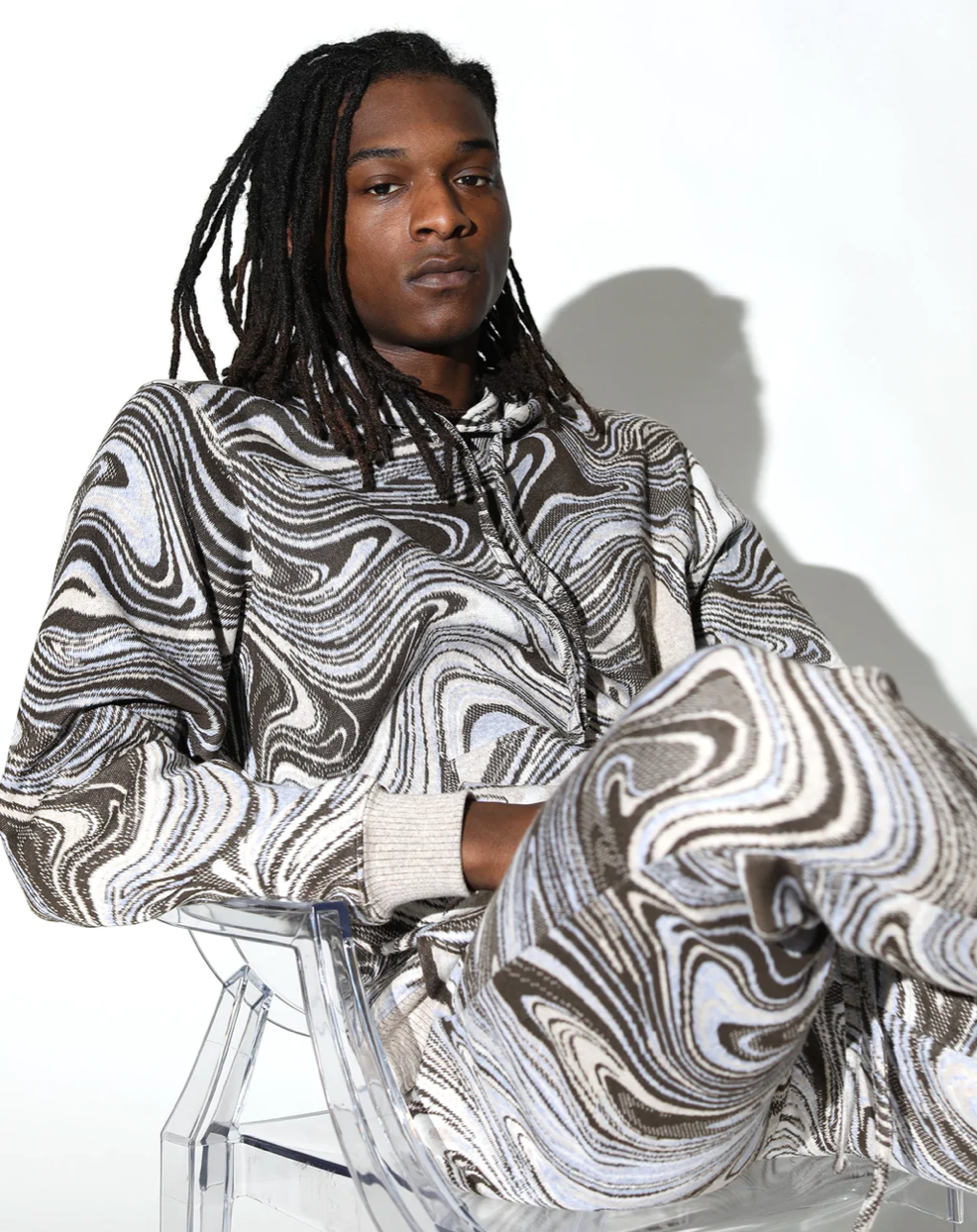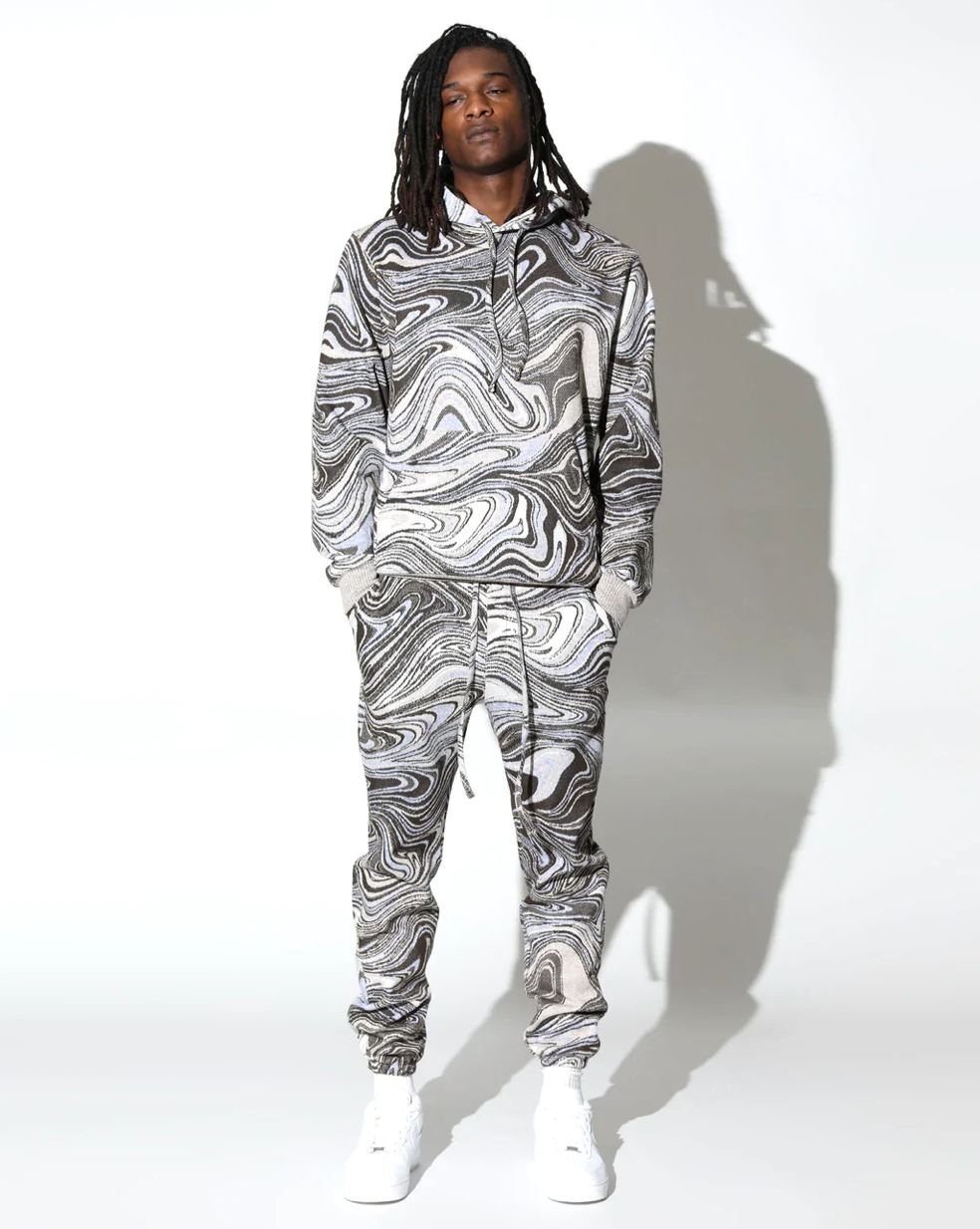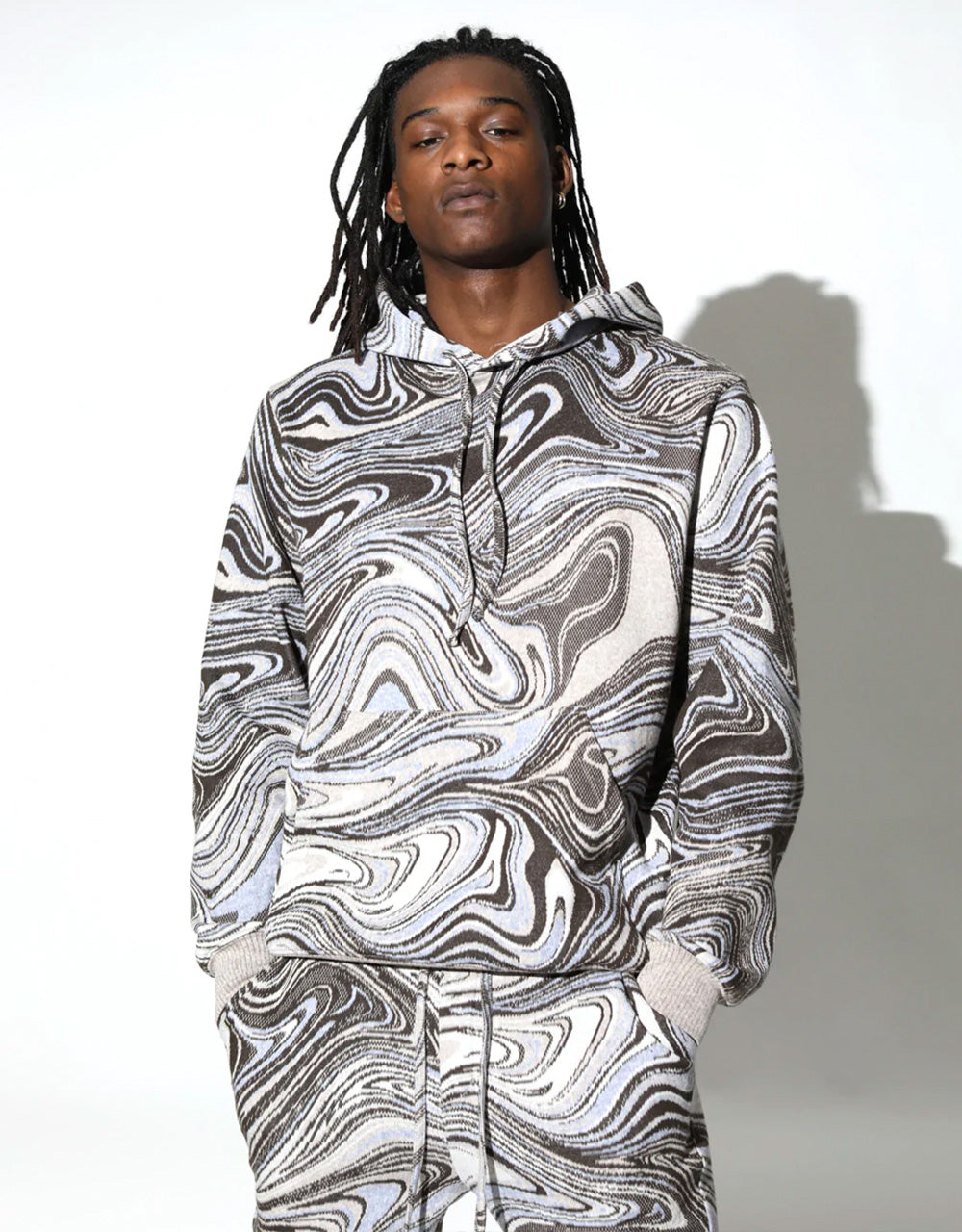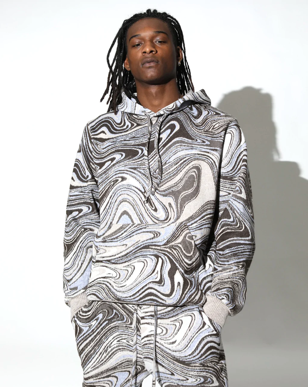 Custom milled Hyper Reality Knit in the Liquid Swirl pattern. Adjustable Drawstring, Long sleeves, Custom ribbing at cuffs and hems. Made in Canada. Body: 50% Cotton, 48% Polyester, 2% Spandex, Trim: 48% Polyester, 47% Cotton, 5% Spandex. Machine Wash Cold Delicate cycle, Do Not Bleach, Re-Shape and Lay Flat to Dry. Iron Low as Needed.