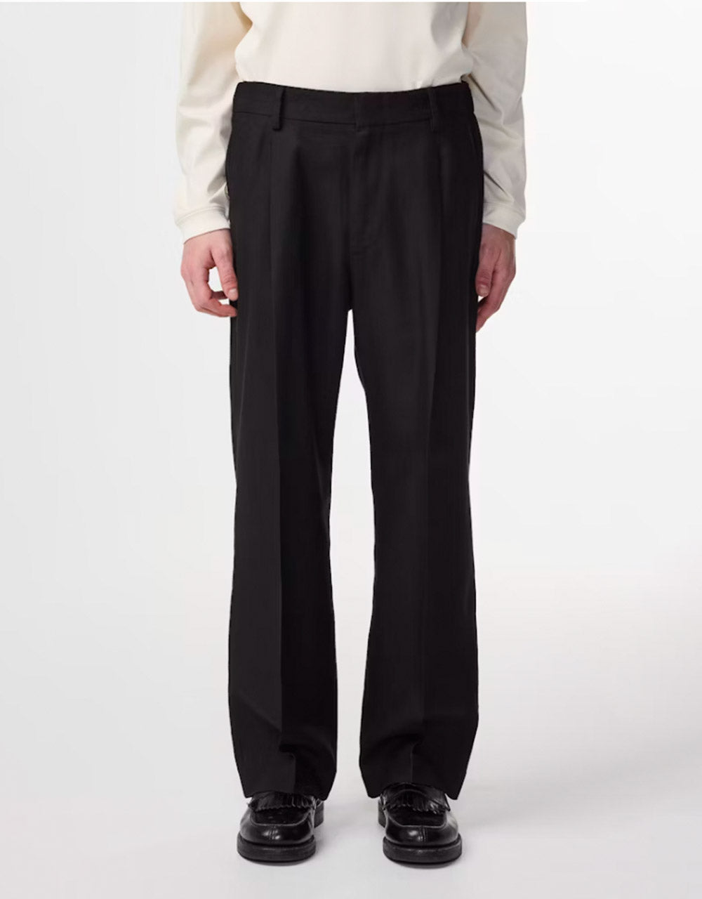 Relaxed-fit dress trousers with front pleats and a soft, drapey handfeel. Made from a 290 g/m² Panama weave fabric in a durable viscose and European linen blend. Treated with an enzyme wash and finished with back pockets and a hook-and-bar closure.