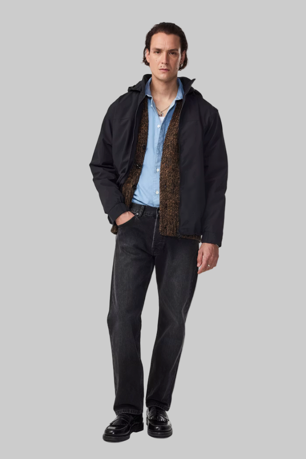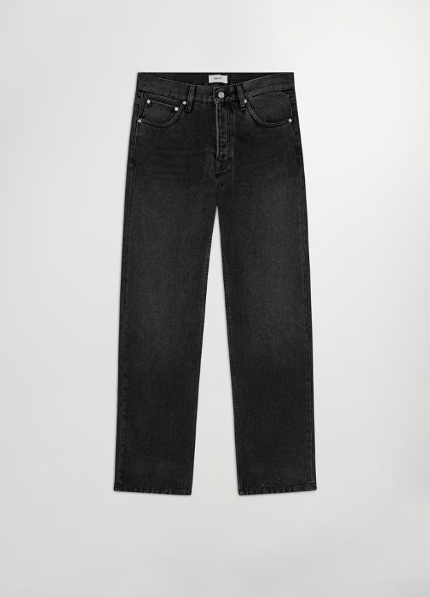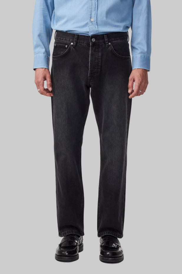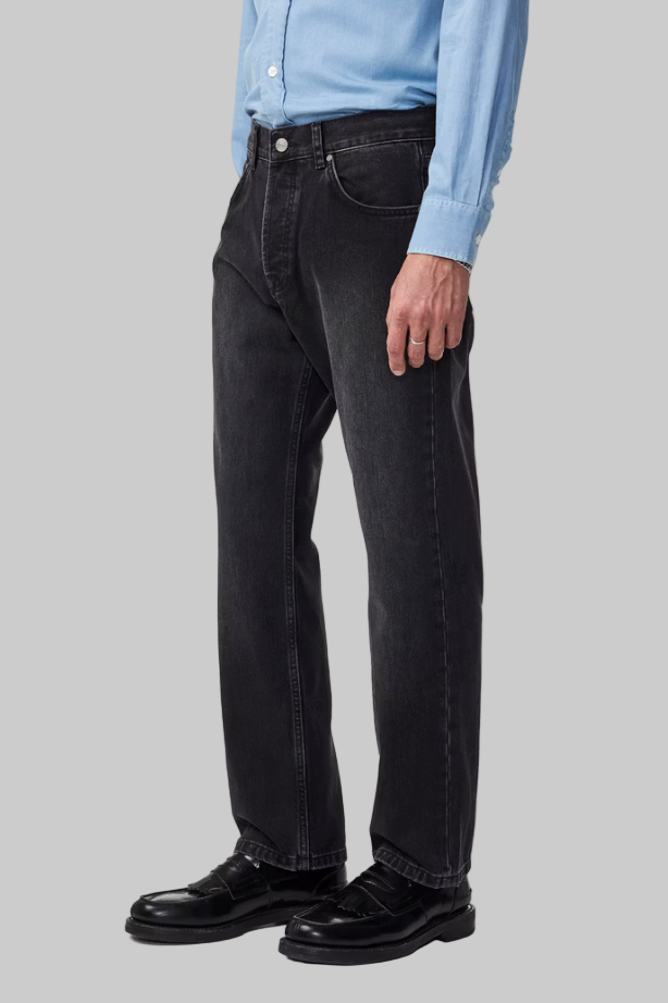 Relaxed, stone washed straight-leg jeans, crafted from sturdy 13.50 oz midweight cotton denim. Designed with whiskering and sanding effects, five-pocket styling, matte silver metal button closure with matching rivets, and finished with blue embroidery stitching along the back pocket.