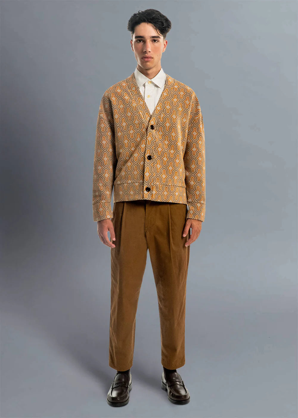 This cardigan carries an unmistakable edge. The geometric pattern pulls inspiration from mid-century interiors and underground New York style, when rules were meant to be broken and individuality ruled the room. Cut in our Aviator Fit (cropped and boxy). Finished with premium corozo buttons, hand-cut from palm nuts. Produced in small batches, because mass production doesn’t have to be for everyone.