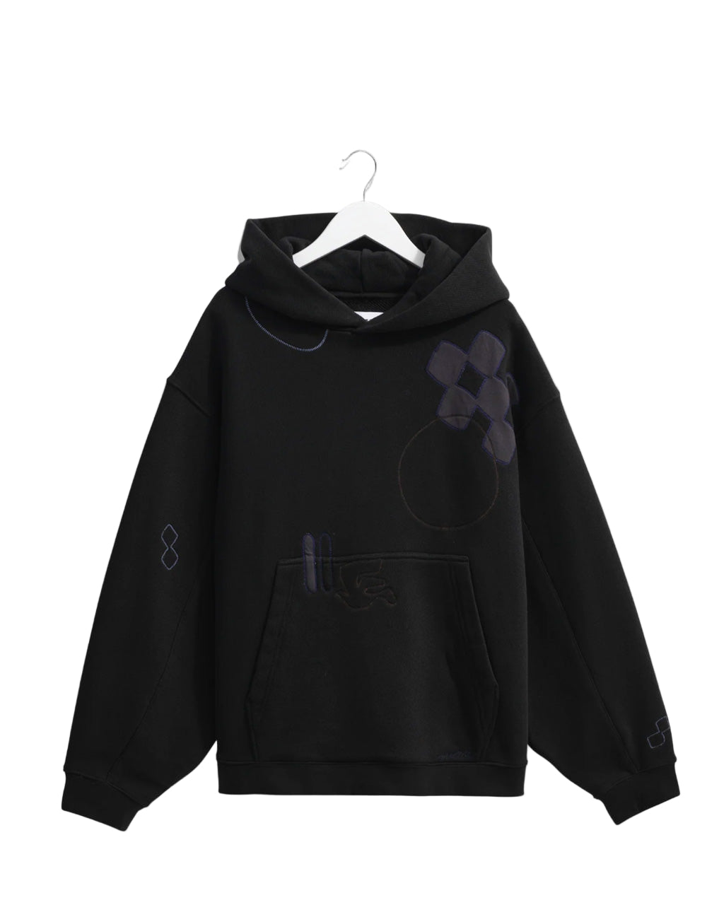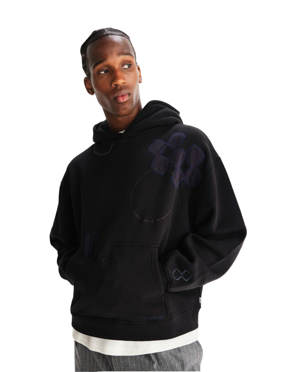 Black Cotton Hoodie with Multi Colored Patchwork and Embroidery