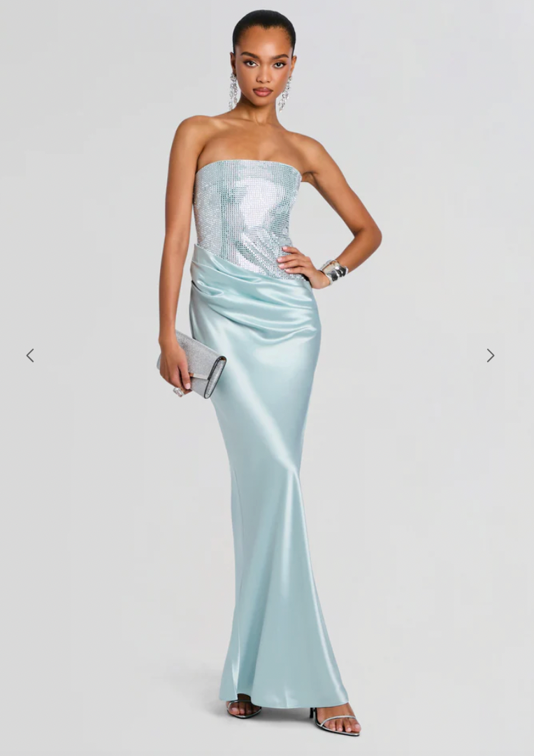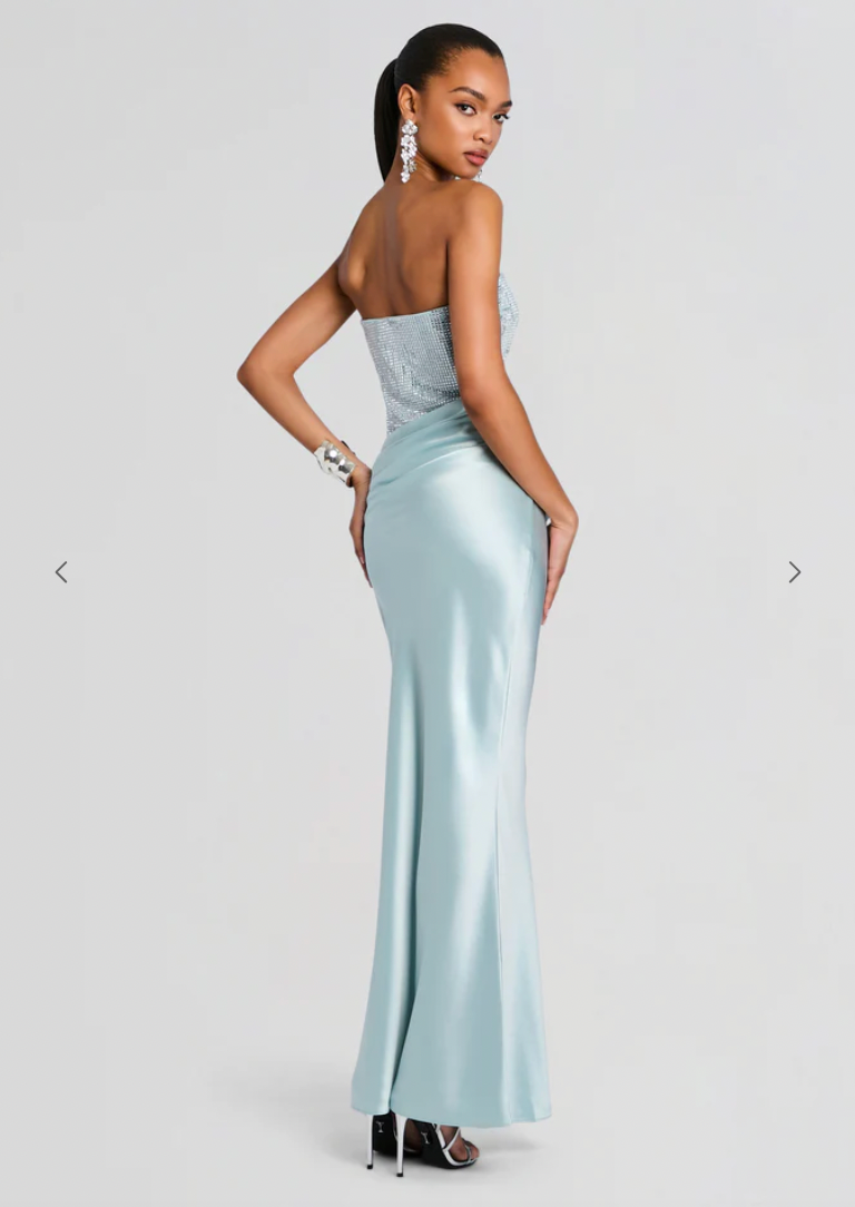 The Alexandra Dress embodies timeless allure with its sleek strapless silhouette and rich satin construction. Delicately adorned with sequins, it strikes the perfect balance of glamour and poise. Shown here in Seychelles.