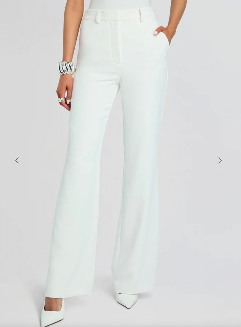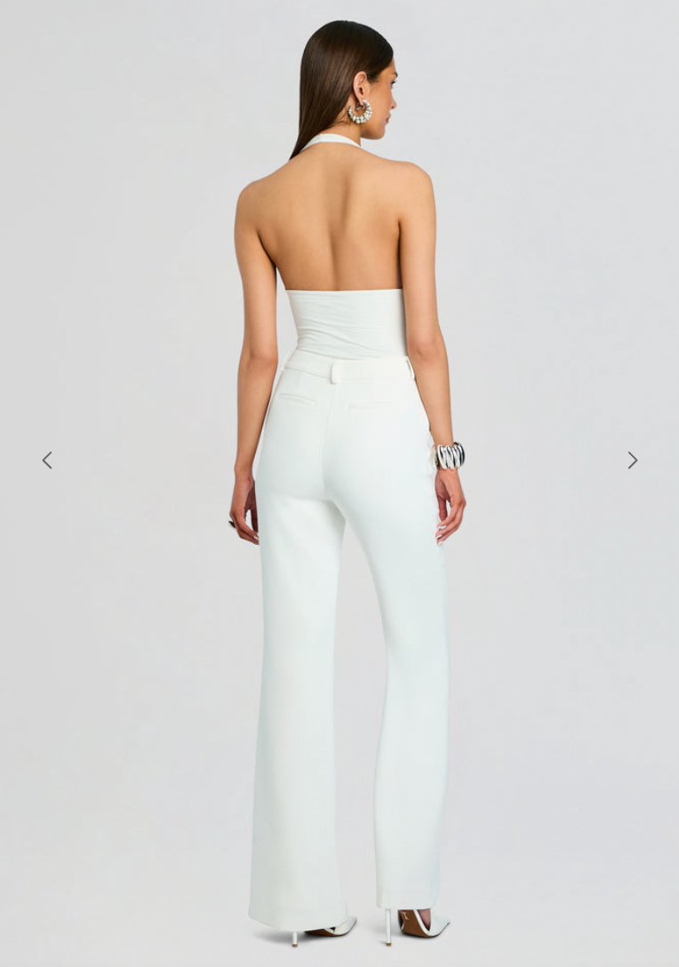 The Eira Pant features a high-waisted silhouette with functional pockets, belt loops, and polished tailoring. Designed for versatility, they transition effortlessly from the office to cocktail hour, offering flattering structure and modern professional elegance. Shown here in White.