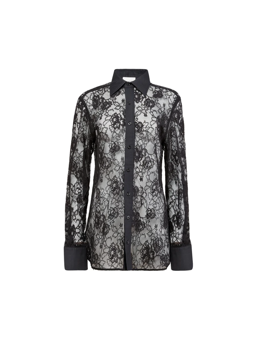 Our Juliet Lace Button Down, featuring silk placket, collar and cuffs with front button closure. Unisex with a relaxed fit. Unlined.