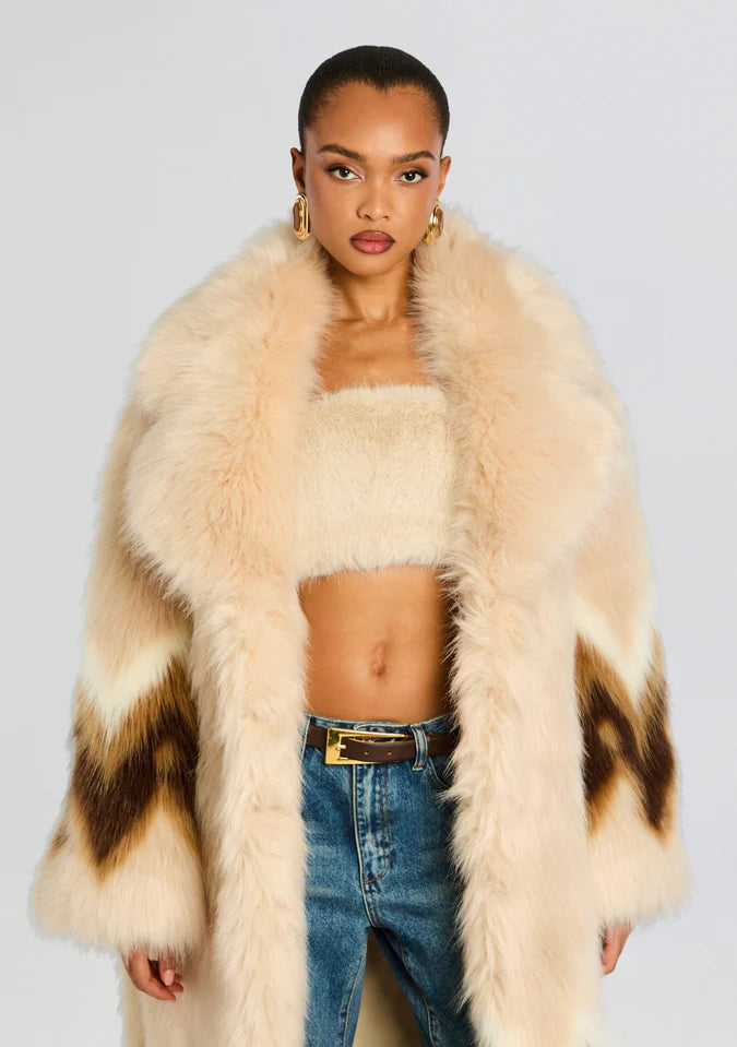 The Magali Faux Fur Coat is a luxurious chevron-print faux fur coat with a belted waist. Designed for ski lodge glamour and winter gatherings, it transitions from après-ski soirées to formal evening events. Shown here in Multi.
