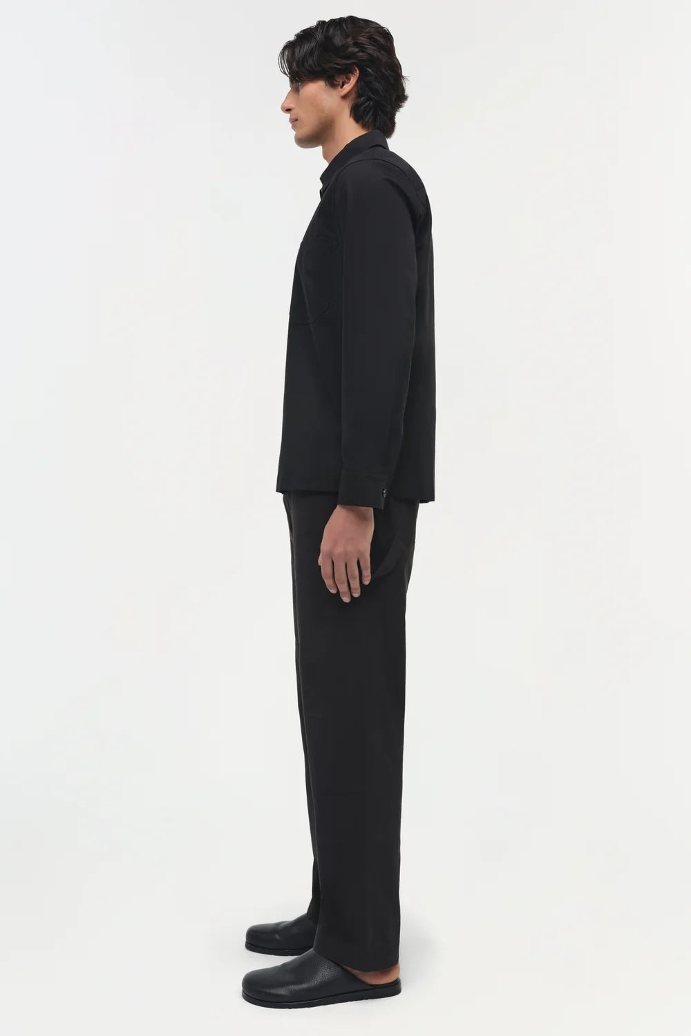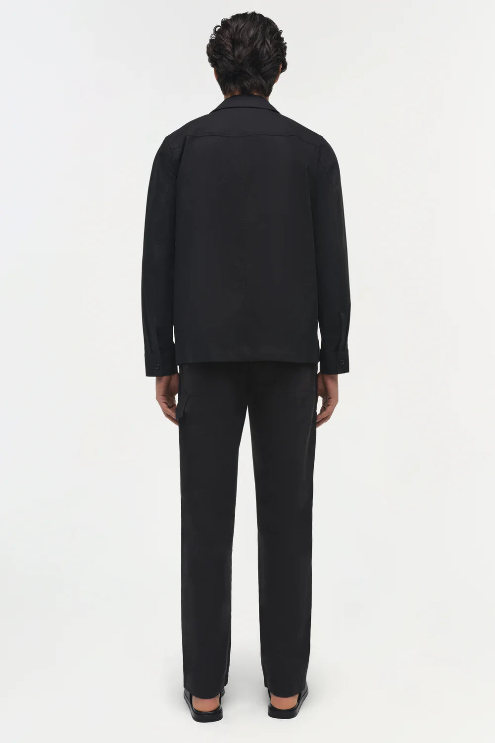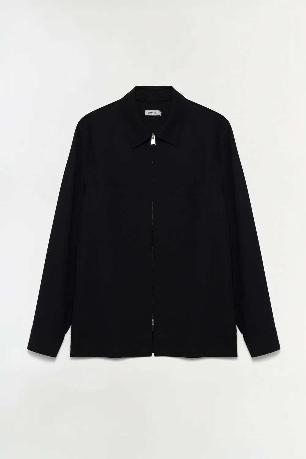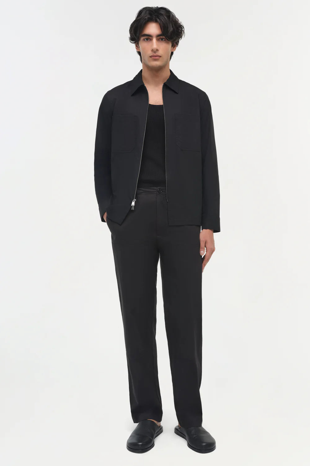 Crafted from refined utility fabric, this jacket balances relaxed ease with structured form. The pointed collar, zip-front closure, and functional pockets give it a modern, understated profile.