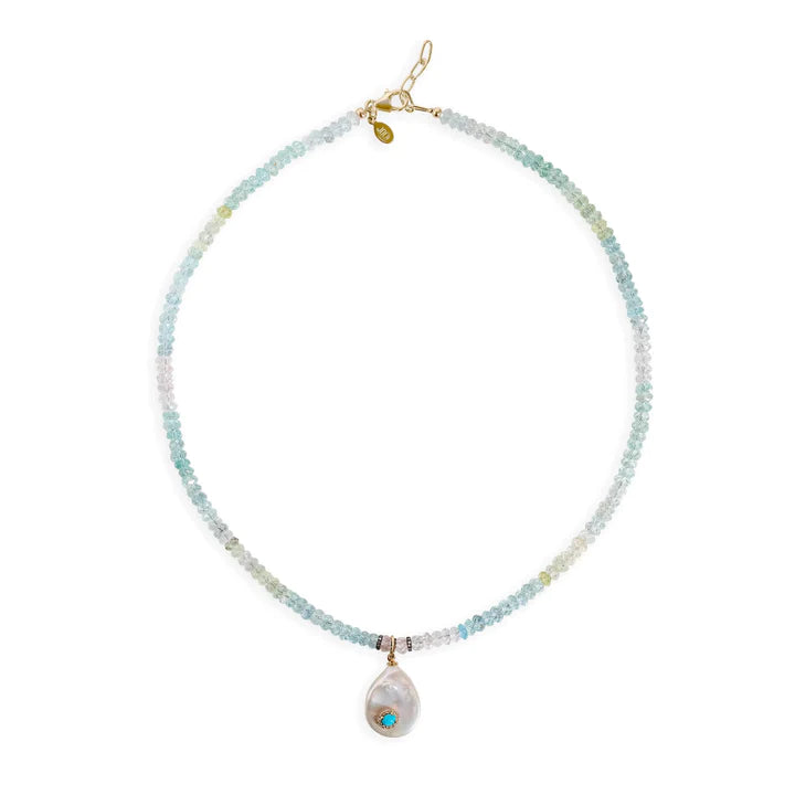 AAA 5MM ombré aquamarine and turquoise, Diamond and Gold Flat Freshwater Pearl with Diamond Accents and a 14K Gold lobster clasp on a 15-17” chain.