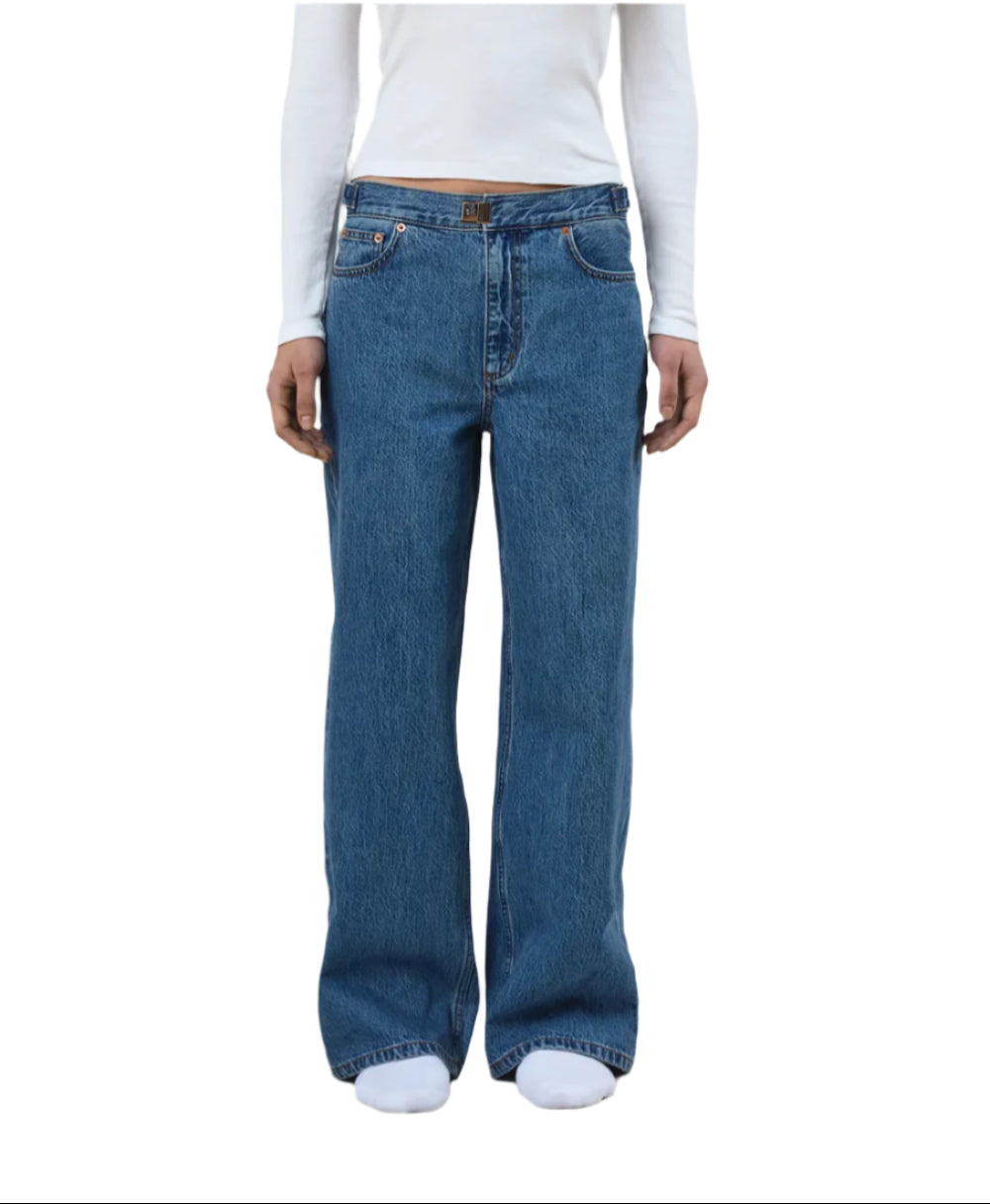Chrome Buckle Hardware and Adjustable Waistband Side Fasteners to Wear as Mid or Low Rise Jean