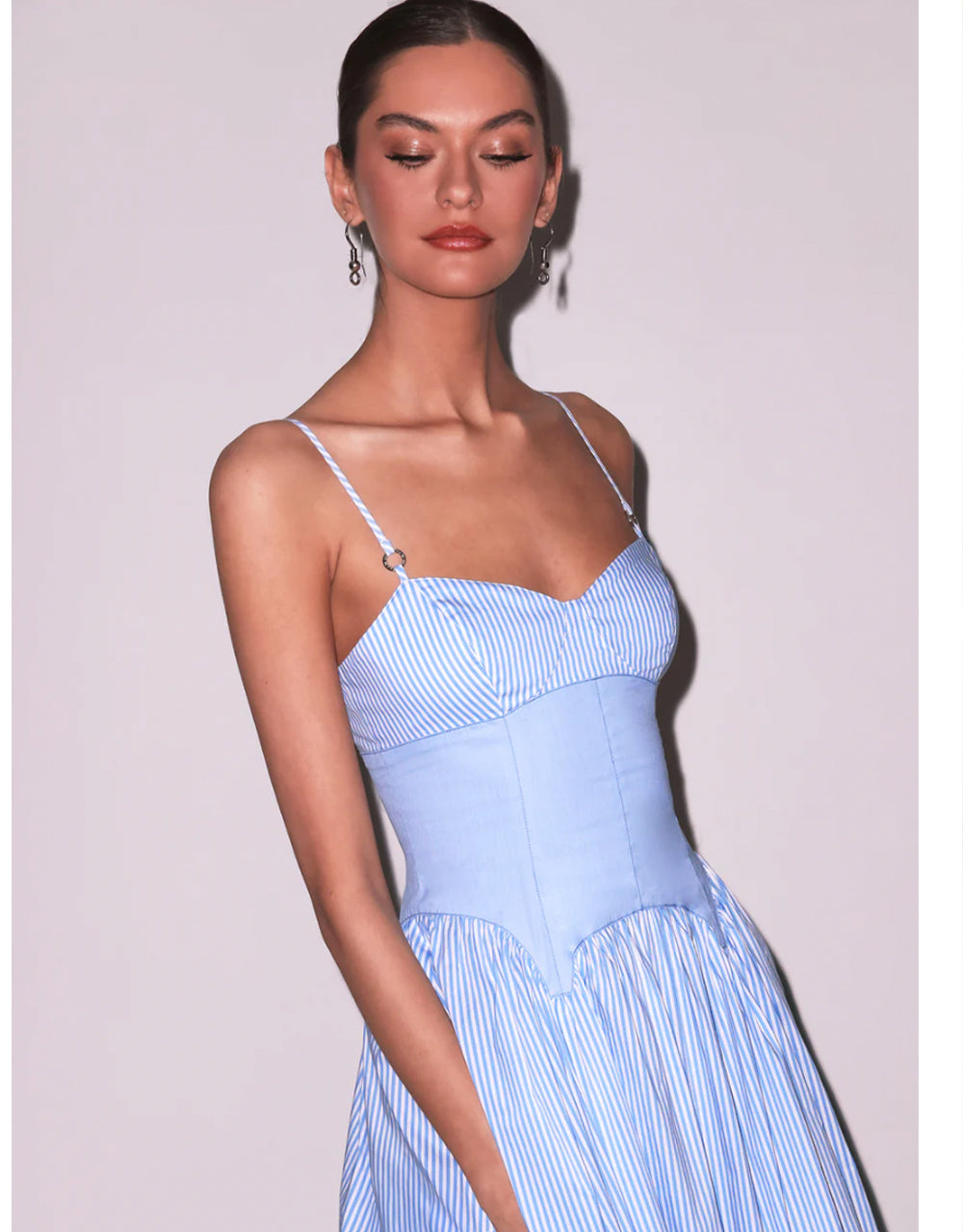 Our lightweight cotton Poplin Cupped Midi Dress, featuring corset inspired underbust & garter seaming details with adjustable straps and invisible zip closure. Flirty full volume skirt with higher cut hemline at sides. We love it layered over the matching Poplin Lace Cheeky.