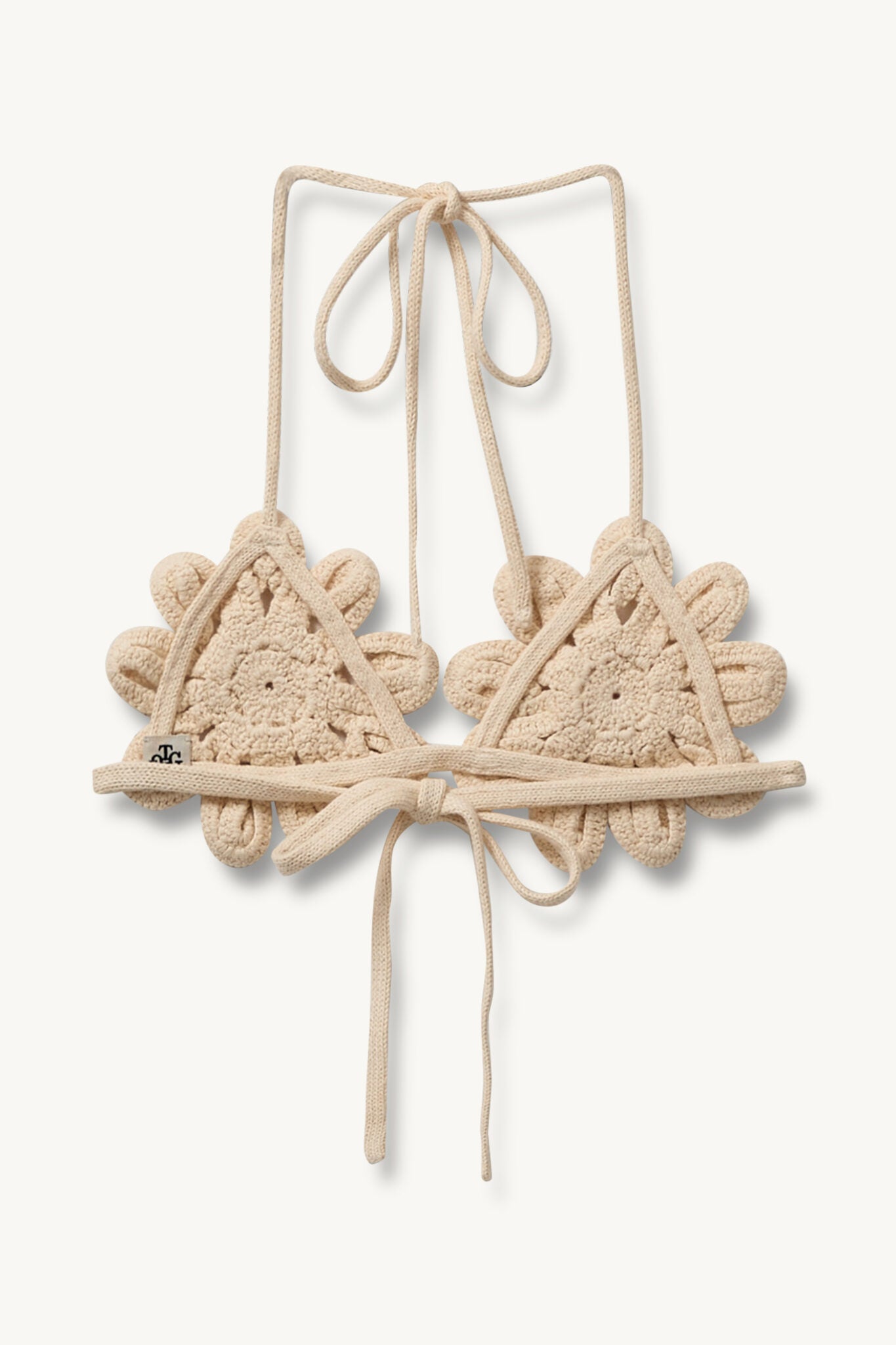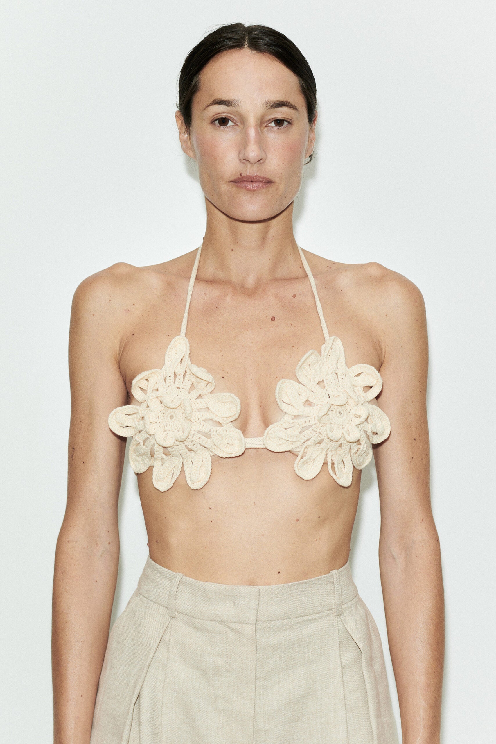 The Egypt Bra Top is a knitted bra with flower artwork made from a cotton and linen blend. It seamlessly blends comfort with style, offering a beautiful flower motive to complete your outfit.