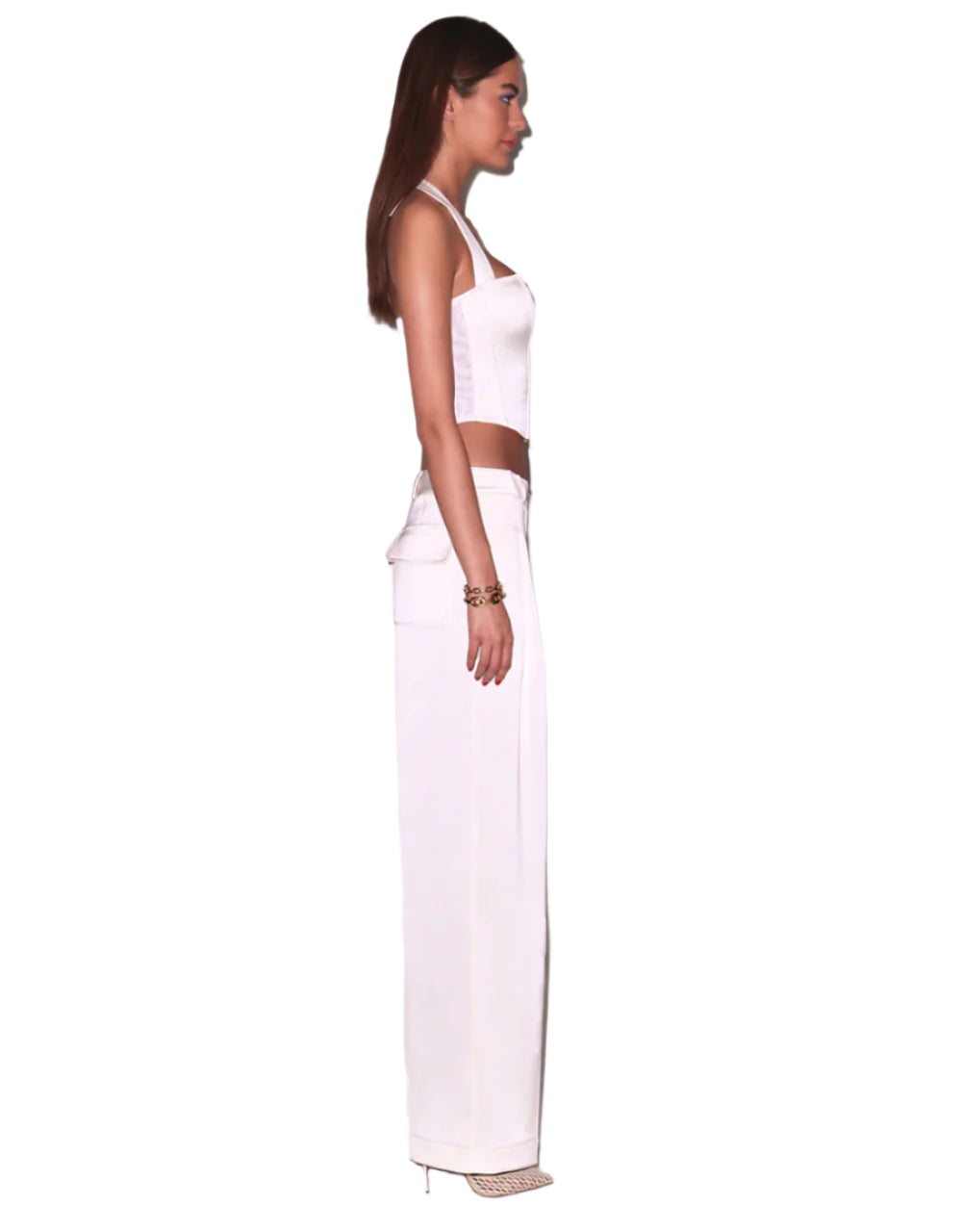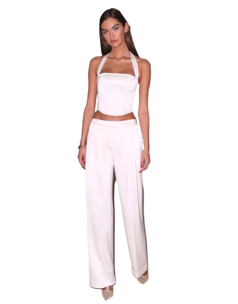 Our Satin Trouser, featuring a comfortable, relaxed fit with front pleats. Low rise with front and back pockets. Pair with the Satin Halter Corset Top for a chic, monochromatic look.