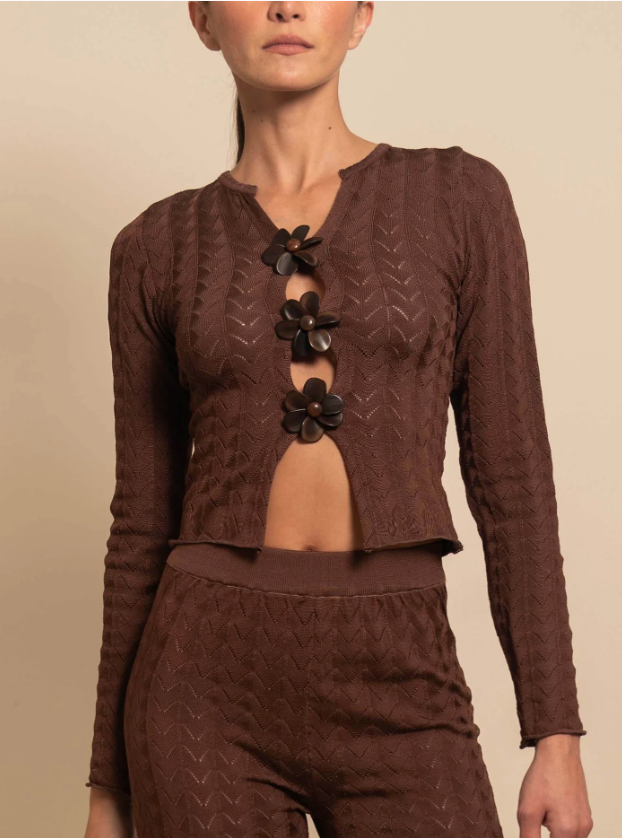 The Marlowe top is a cropped knit cardigan crafted in a soft ivory open stitch fabric that feels both lightweight and elevated. Its standout detail is the row of flower shaped tagua buttons, a signature AZULU element that highlights craftsmanship and individuality. Pair with the Marlowe pant for a complete look.