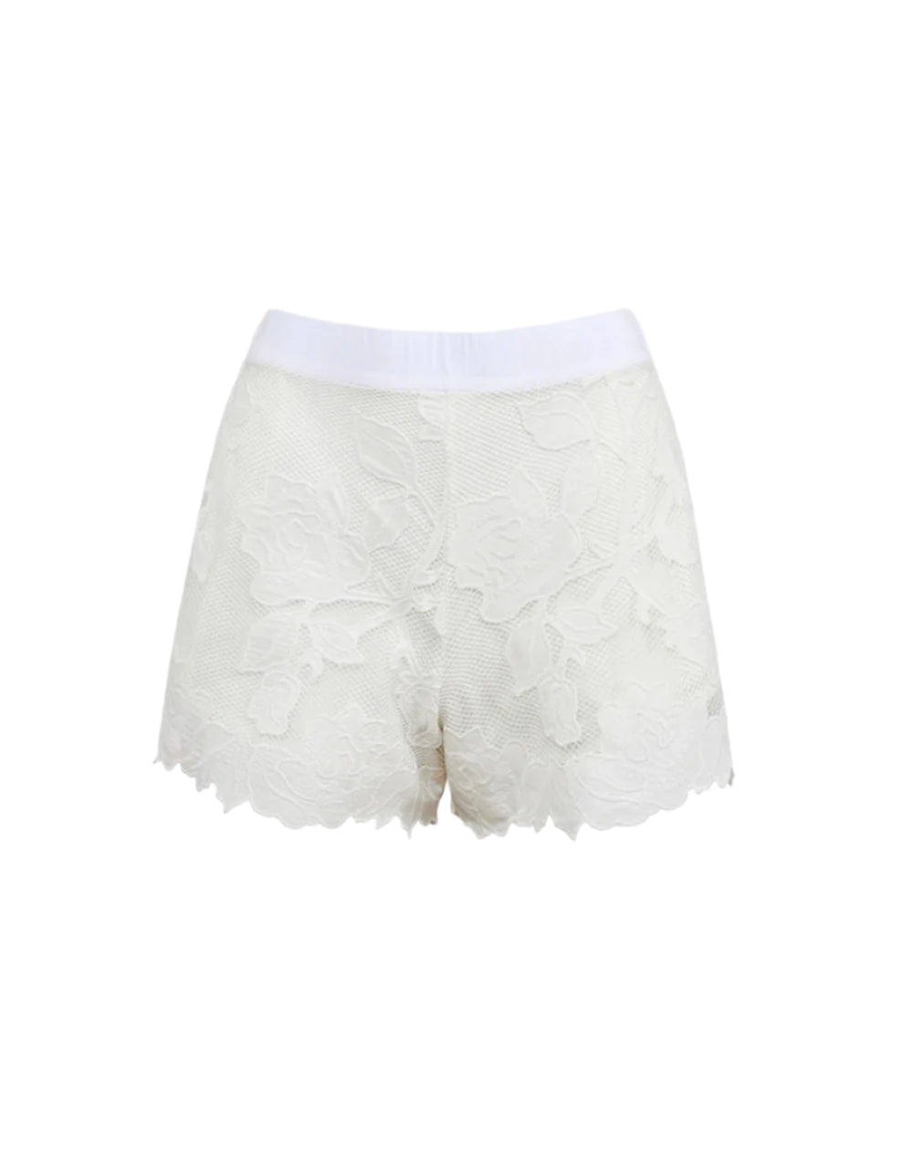 Our Collette Short, with custom floral embroidery and satin lining. Features front pockets, elastic waistband, and scalloped edges. Complete the set with the matching Collette Cropped Shirt.