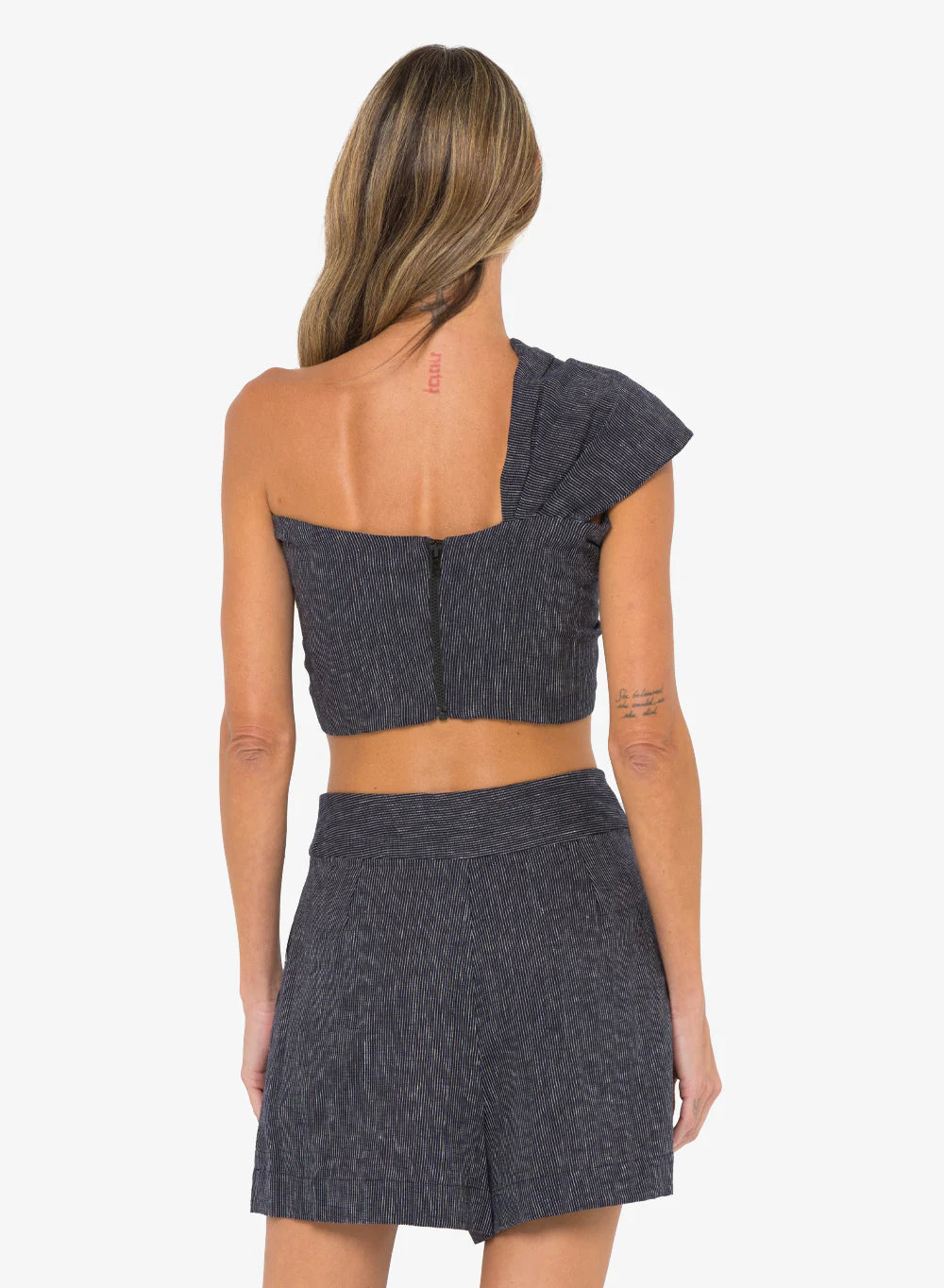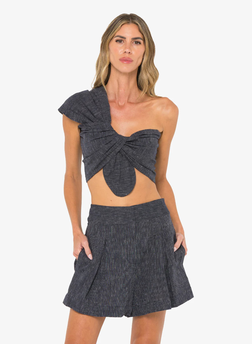 55% linen, 45% rayon. Made in USA. Machine wash. Zip fly with hook and bar closure. Side seam pockets. Front pleated detail. Shorts measure approximately 16" in length.