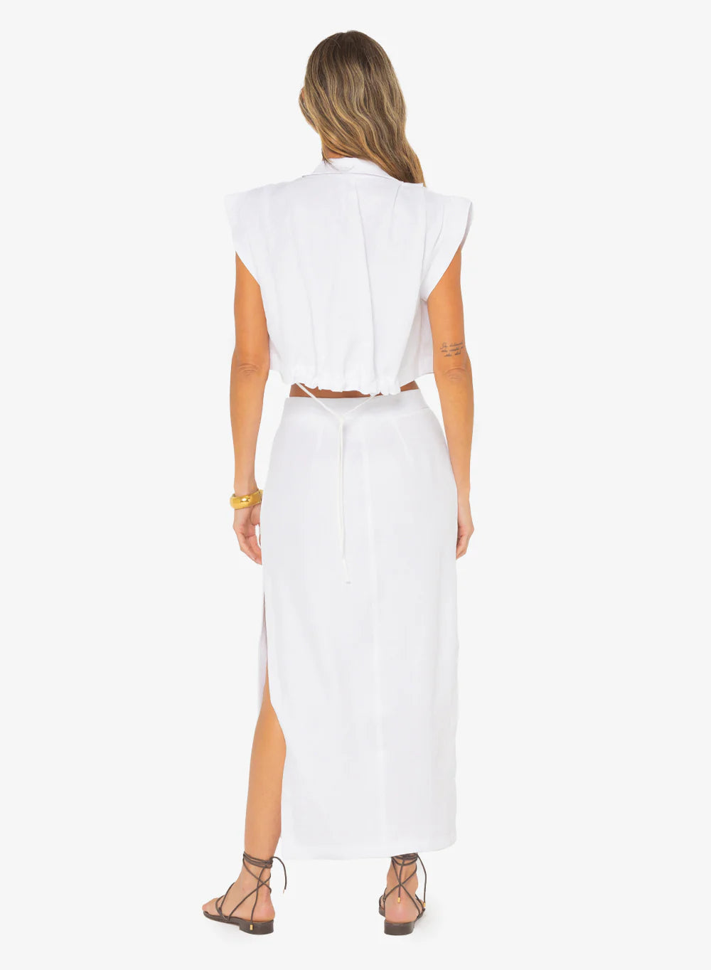 High-rise maxi skirt with front pockets and side slits. Tencel-cotton blend for a soft, airy feel. Made in the USA by JBQ. High-rise maxi skirt Thigh-high side slits Front slip pockets Straight silhouette from hip to hem Hidden hook and zip fly