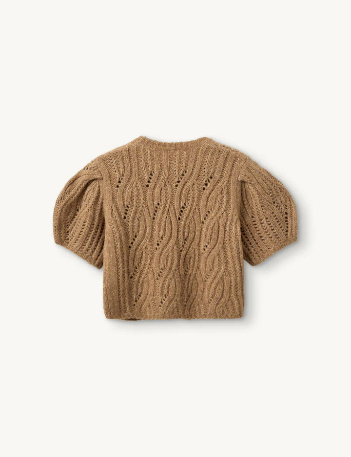 The Valentina Sweater is a cozy knit top featuring voluminous puff sleeves in T-Shirt length. Its knit texture adds a playful yet stylish look to any outfit.