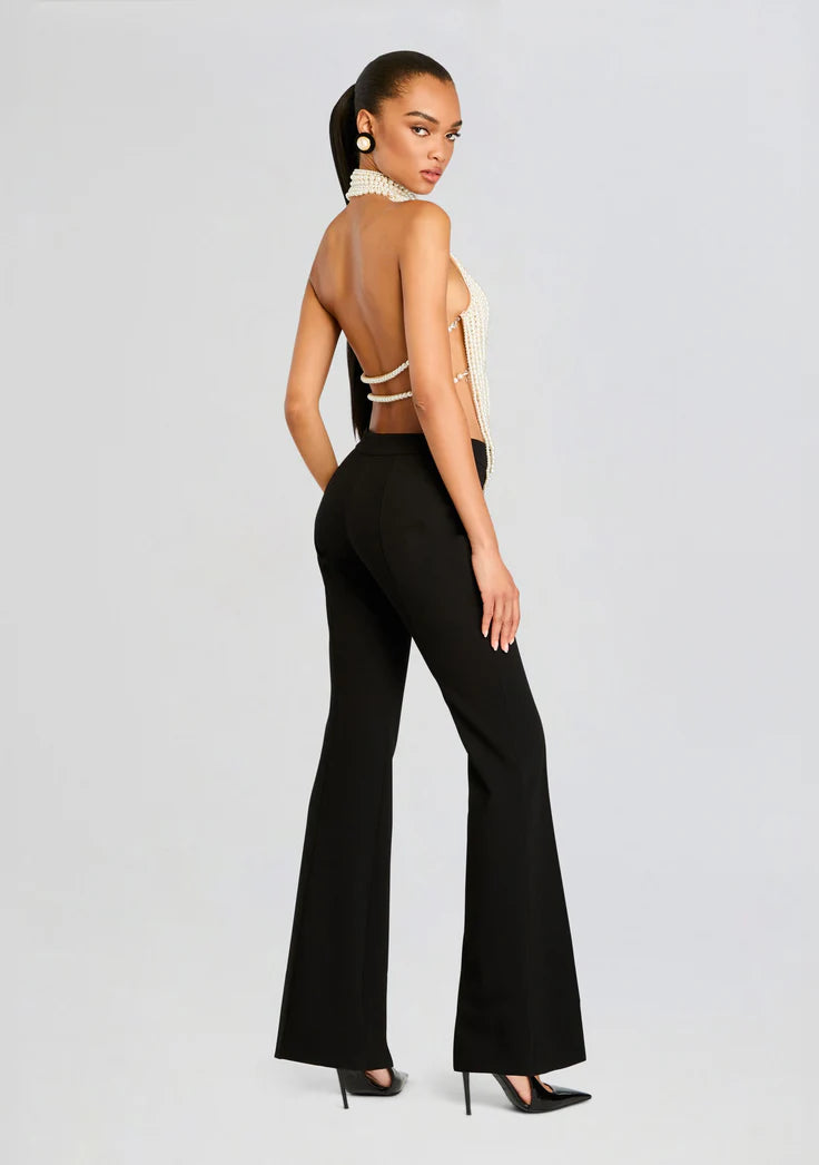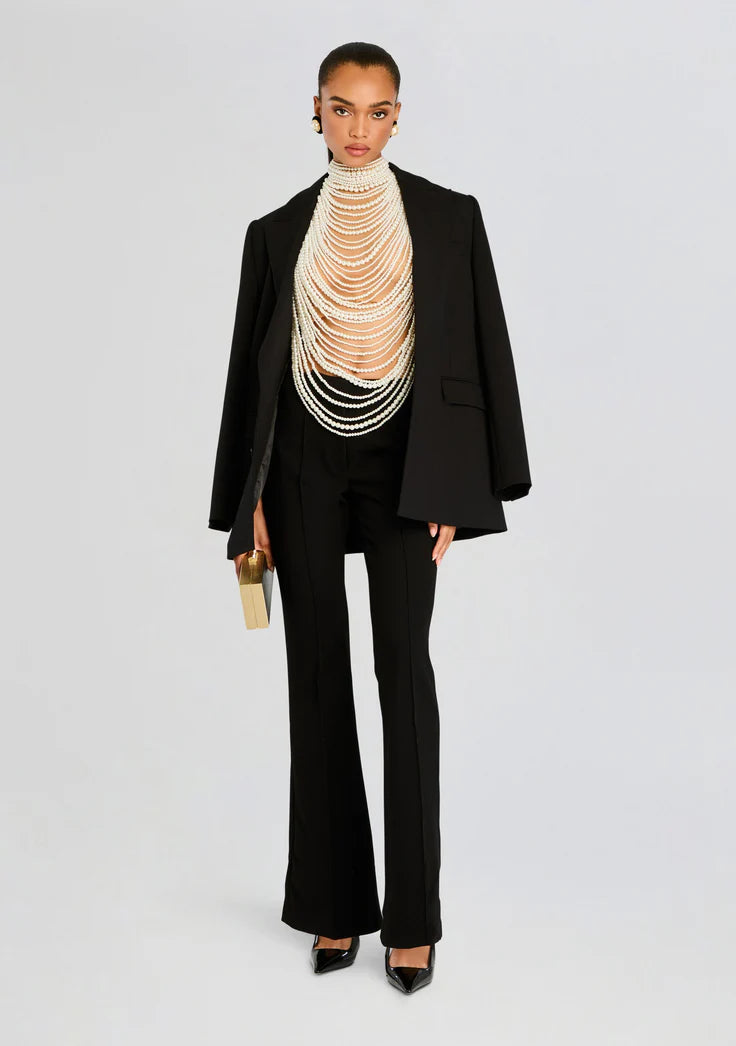 This sophisticated halter top features meticulous hand-beading with lustrous faux pearls cascading across a draped silhouette. Crafted from premium nylon with a lined interior for comfort and structure, each piece is expertly constructed in India. The elegant design flatters with its refined draping technique and pearl embellishment, creating a statement piece perfect for elevated occasions. Model pictured is 5'10" in size small.