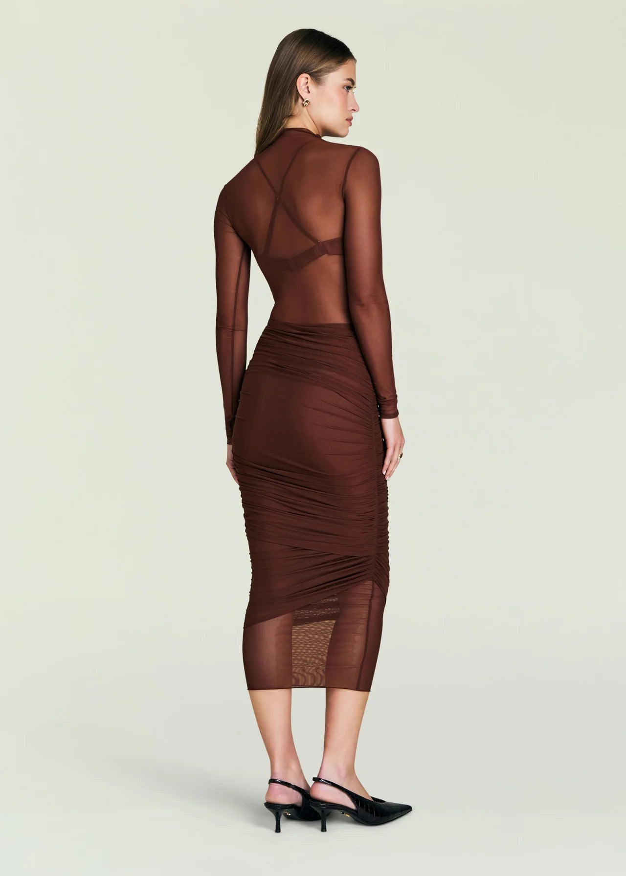 Elegant long-sleeve top featuring a refined high neckline and delicate sheer fabrication. Crafted from a premium blend of 90% polyester and 10% spandex for optimal drape and subtle stretch. This piece, pictured in Burnt Toffee, offers sophisticated layering versatility. Model wears size XS at 5'10". Undergarment recommended. Made in China.