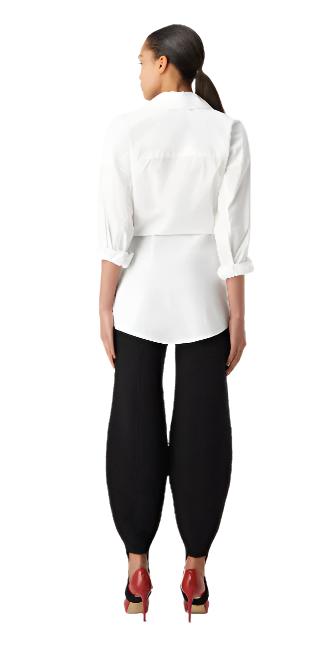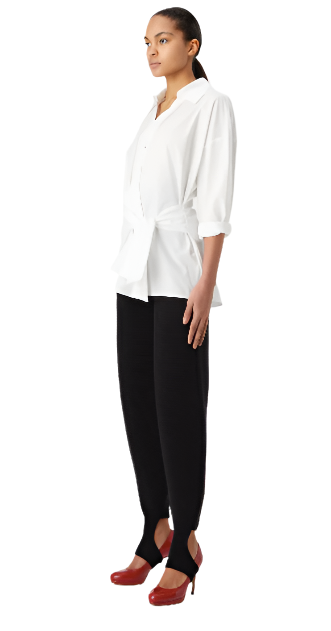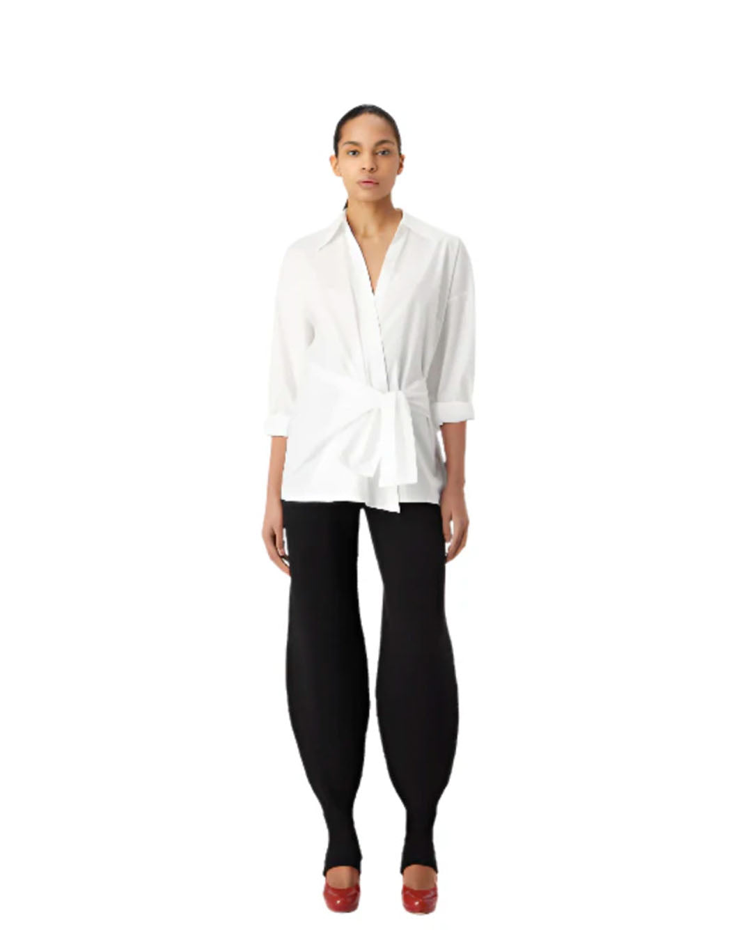 The Alamos Shirt boasts a long silhouette that gracefully falls below the hips, complemented by long sleeves with wide, sophisticated cuffs. The classic collar and asymmetrical front add a touch of modernity, while the wide belt cinches the waist, creating a stunning, flattering shape.