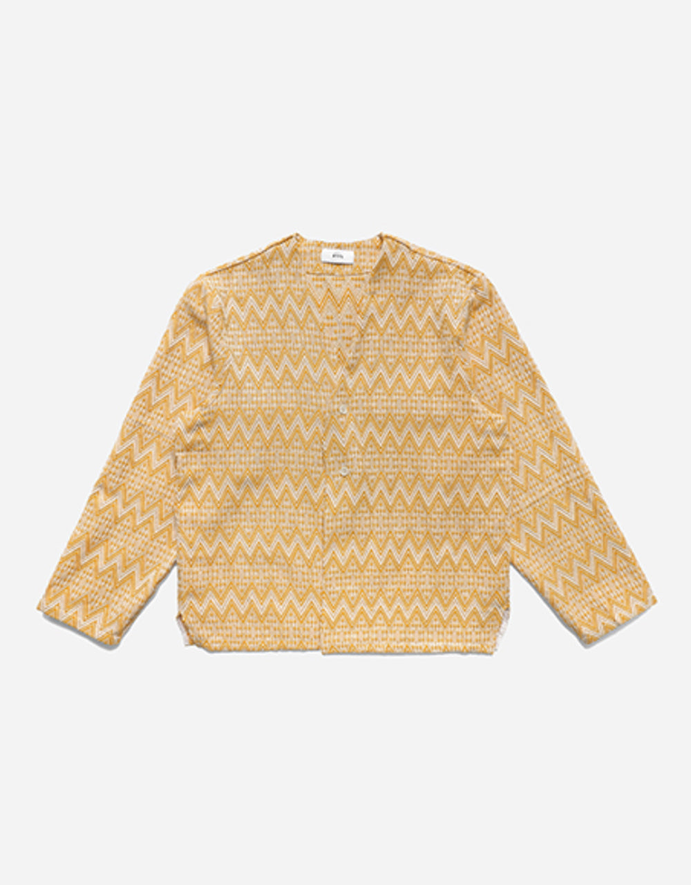Our cardigan shirt made from a hand loomed jacquard fabric with a zig zag design. Made for layering and finished with a two button front closure and full bound inside seams.