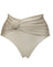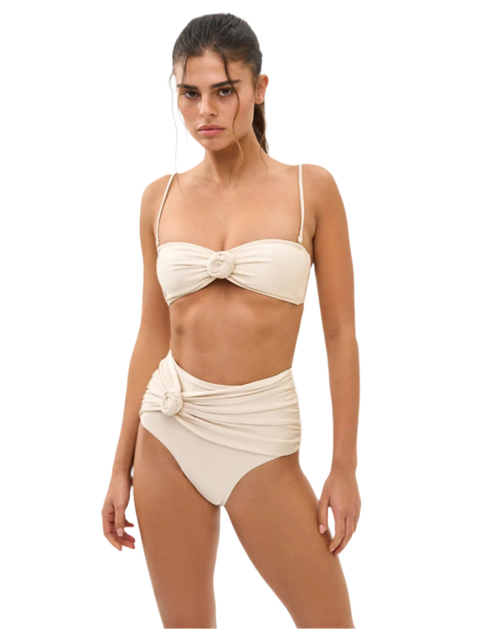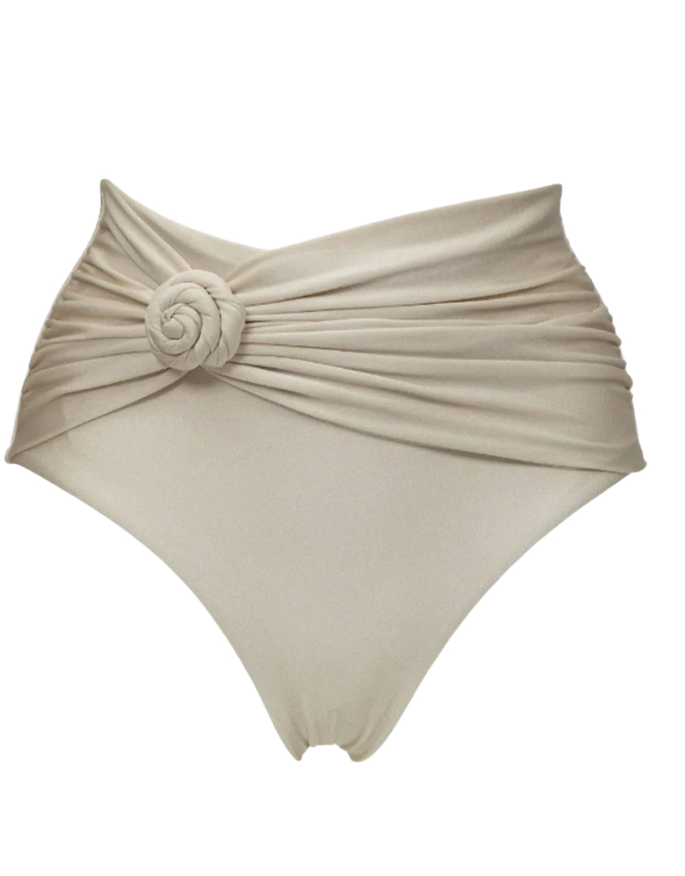 The Carol bottom is a high-waisted bikini bottom with a sophisticated and flattering design. It features draped detailing along the waist, accentuated by a knotted rose embellishment on one side, adding an elegant and feminine touch. The high-cut leg elongates the silhouette, making it a perfect blend of timeless style and modern sophistication.
