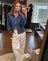 Denim shacket in classic clue with silver snaps and adjustable tab and waist.