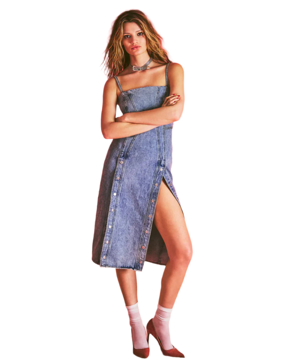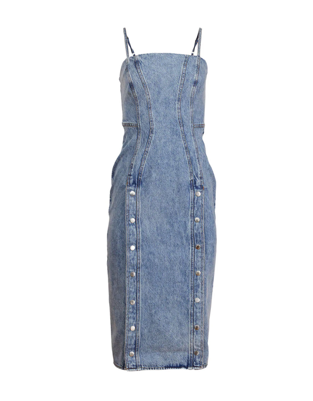 Keep things buttoned up or come undone in our Denim Undo Me Dress. Hugs your body in all the right places, with silver snap buttons to show as little or as much leg as you want. Midi length with adjustable straps. Back zipper closure. Layer over your favorite Essentials panty for a chic look that will take you from happy hour to after hours.
