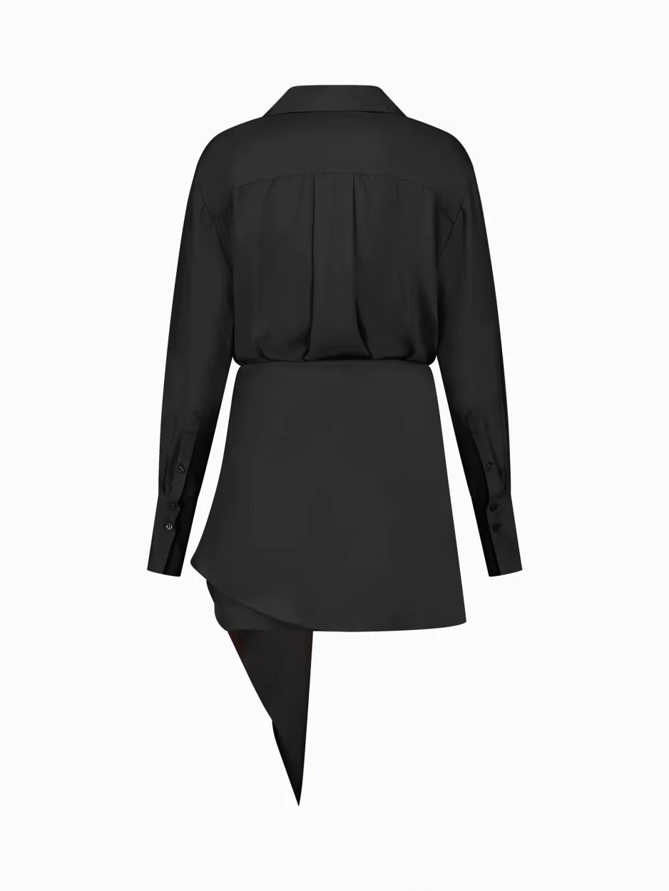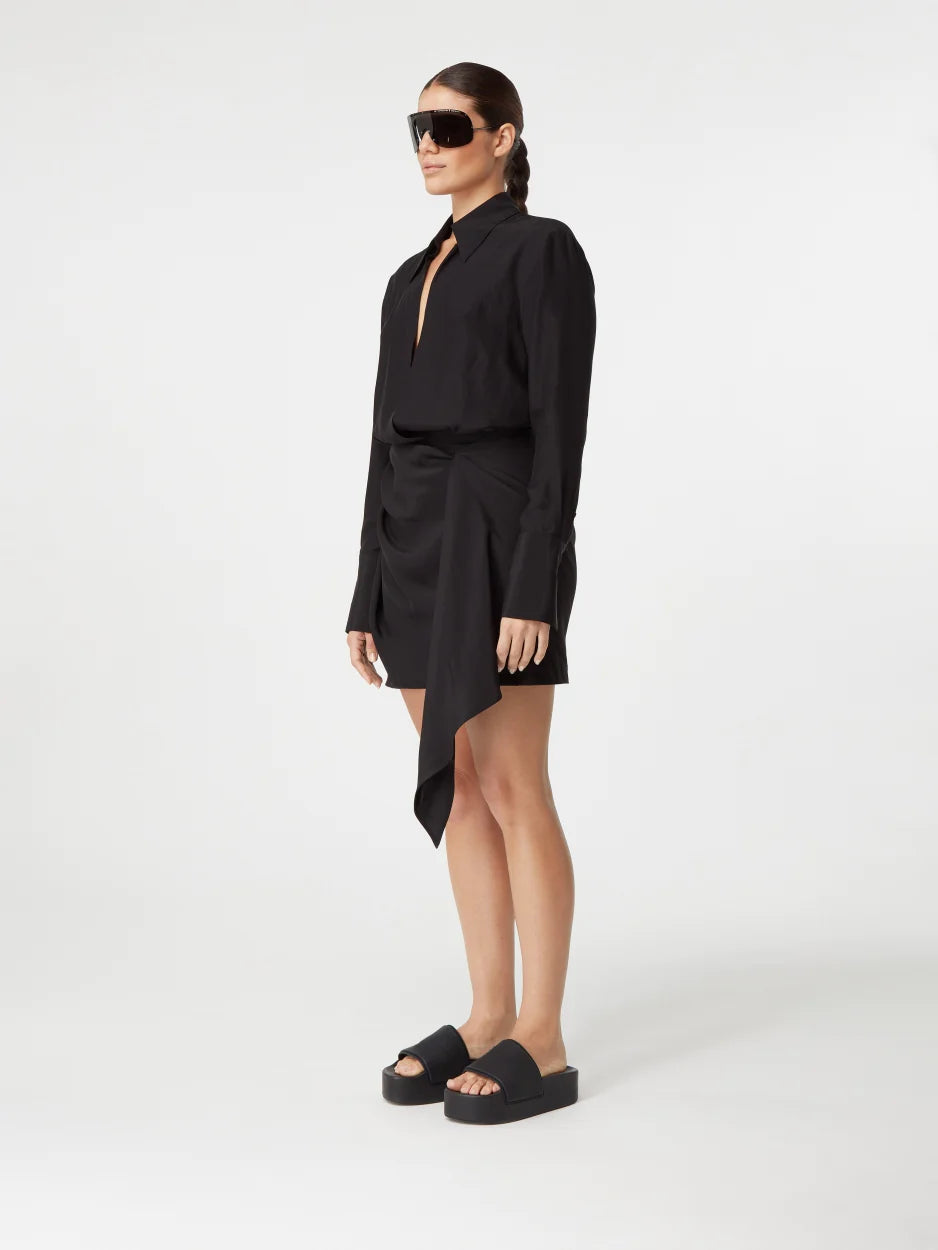 The silky embrace of the GRAVIA dress is accentuated by a thin strap across the front, connecting to a second silk layer that delicately envelops the lower part of the dress.