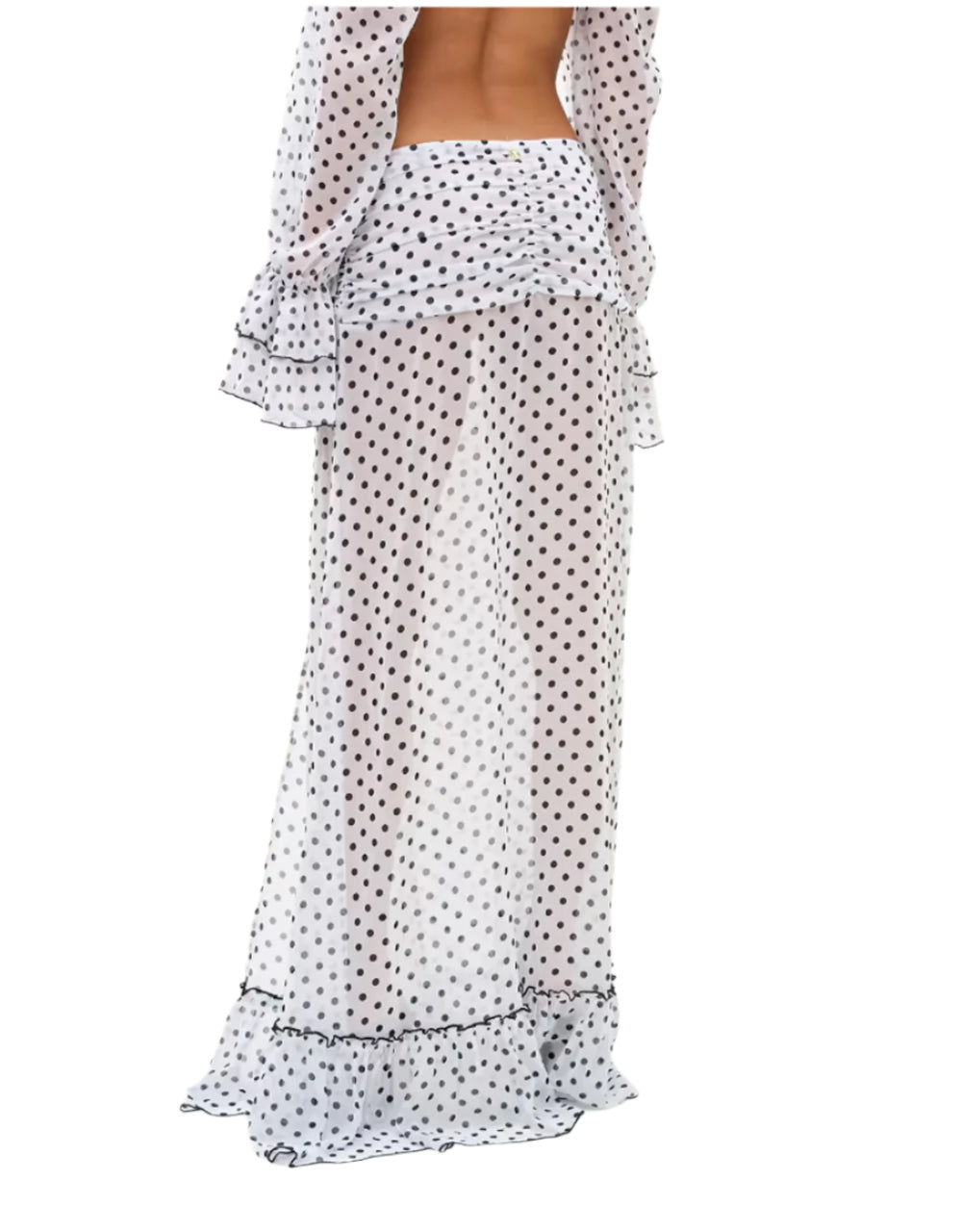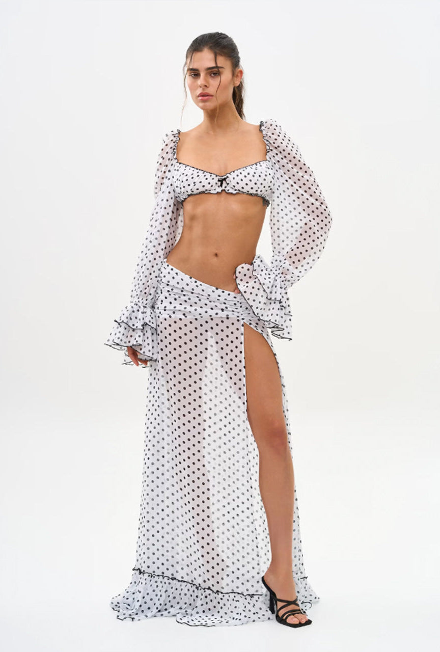 The JOSIE set is a dreamy, bohemian-inspired two-piece, perfect for effortless elegance. The JOSIE Skirt is a flowing maxi with a high waist and soft, layered detailing, creating a romantic and airy silhouette ideal for beachside escapes