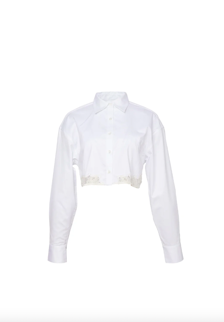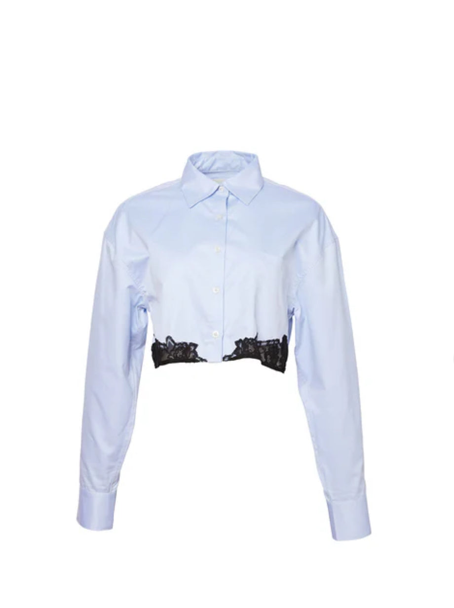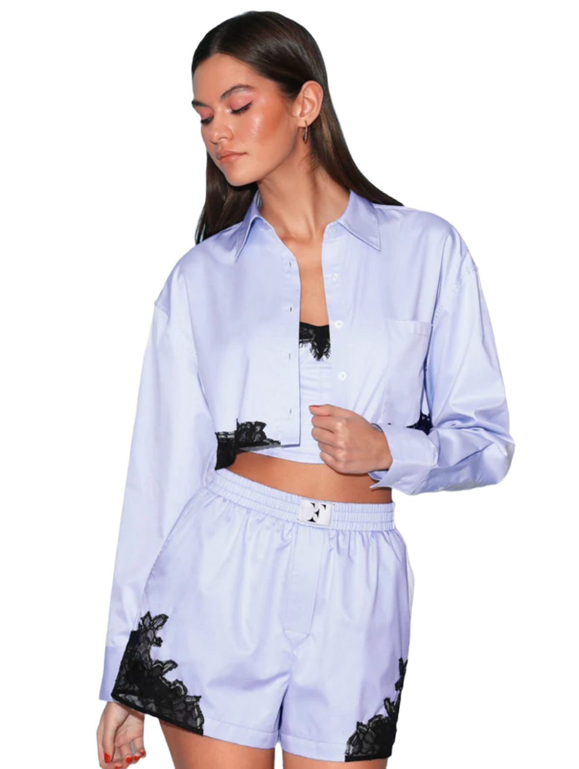 Lightweight European cotton Poplin Cropped Button Down with handcut lace detail at sides. Features a loose, comfortable fit. Complete the set with the matching Poplin Boxer Short.