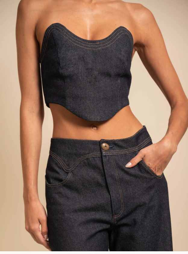 The Micah top is a structured strapless bustier crafted in dark denim with contrast stitching that highlights it architectural lines. Featuring a sweetheart-inspired neckline and sculpted hem, it creates a flattering silhouette with a modern, minimal edge. Finished with an exposed back zipper for ease and style, this piece transitions seamlessly from day to night. Pair it with the matching denim pants for a bold coordinating look.