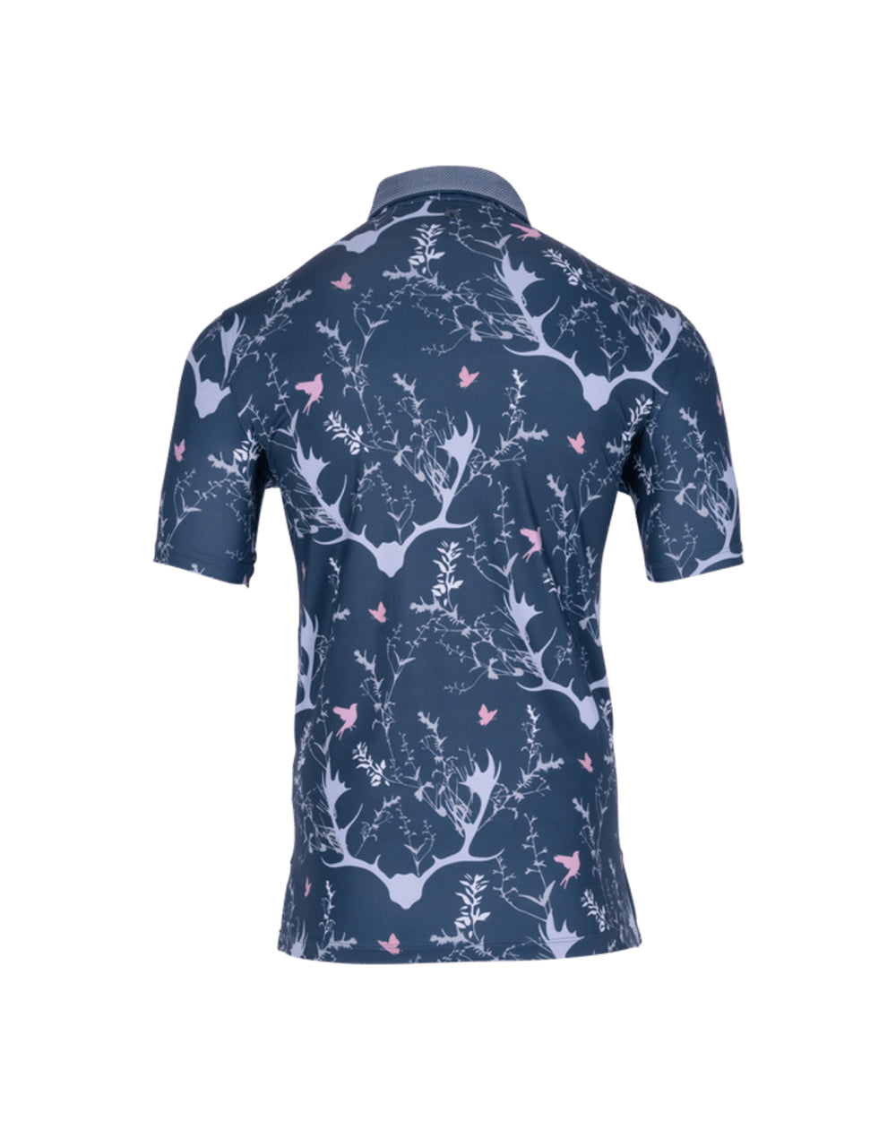 The Reindeer Games Polo is crafted from a polyester and spandex blend to deliver exceptional stretch and comfort on and off the golf course. Featuring deer head motifs against a nature-inspired backdrop, this elevated polo features quick dry and four-way stretch technology for superior performance. Detailed with a knit collar and a three-button placket.