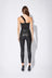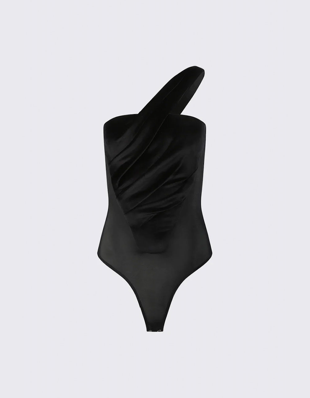 The River Bodysuit in Black Velvet is an asymmetrical, one-shoulder cut in black velvet and featuring mesh panels and a built-in bodysuit. The standout piece is finished with a concealed side zip closure and a thong snap button closure at the seat.